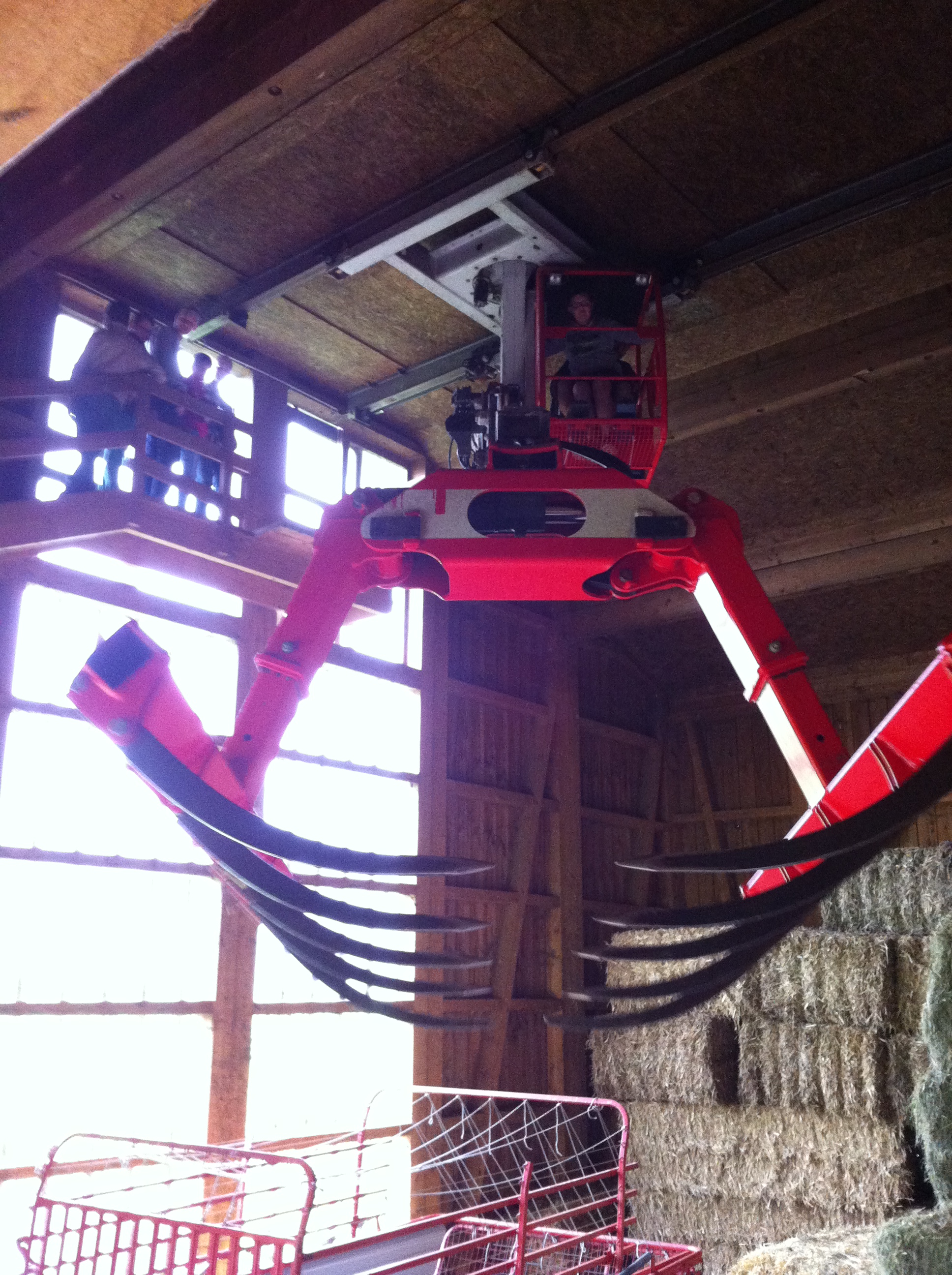 Wir fuhren zum Bauernhof nach Andelsbuch und bekamen die Möglichkeit, noch einmal zu den Kühen zu gehen. Diesmal sahen wir auch die anderen Tiere: Ein Kalb, drei Ziegen und einige Schweine. Parallel fand oben auf dem Heuboden das große „Kranfahrprogramm“ statt, wobei wir mit dem Kran mitfahren durften. Dieser hat einen großen Greifer, mit dem er das Heu vom Heuboden nimmt. Der Fahrer fährt das Fahrzeug in den Stall und der Greifer lässt die „Beute“ wieder los. Herr Rügers Kommentar dazu: „So eine Möglichkeit bekommt ihr womöglich nie wieder!“ In der Hütte packten wir schon wieder unsere Koffer und aßen zu Mittag.
