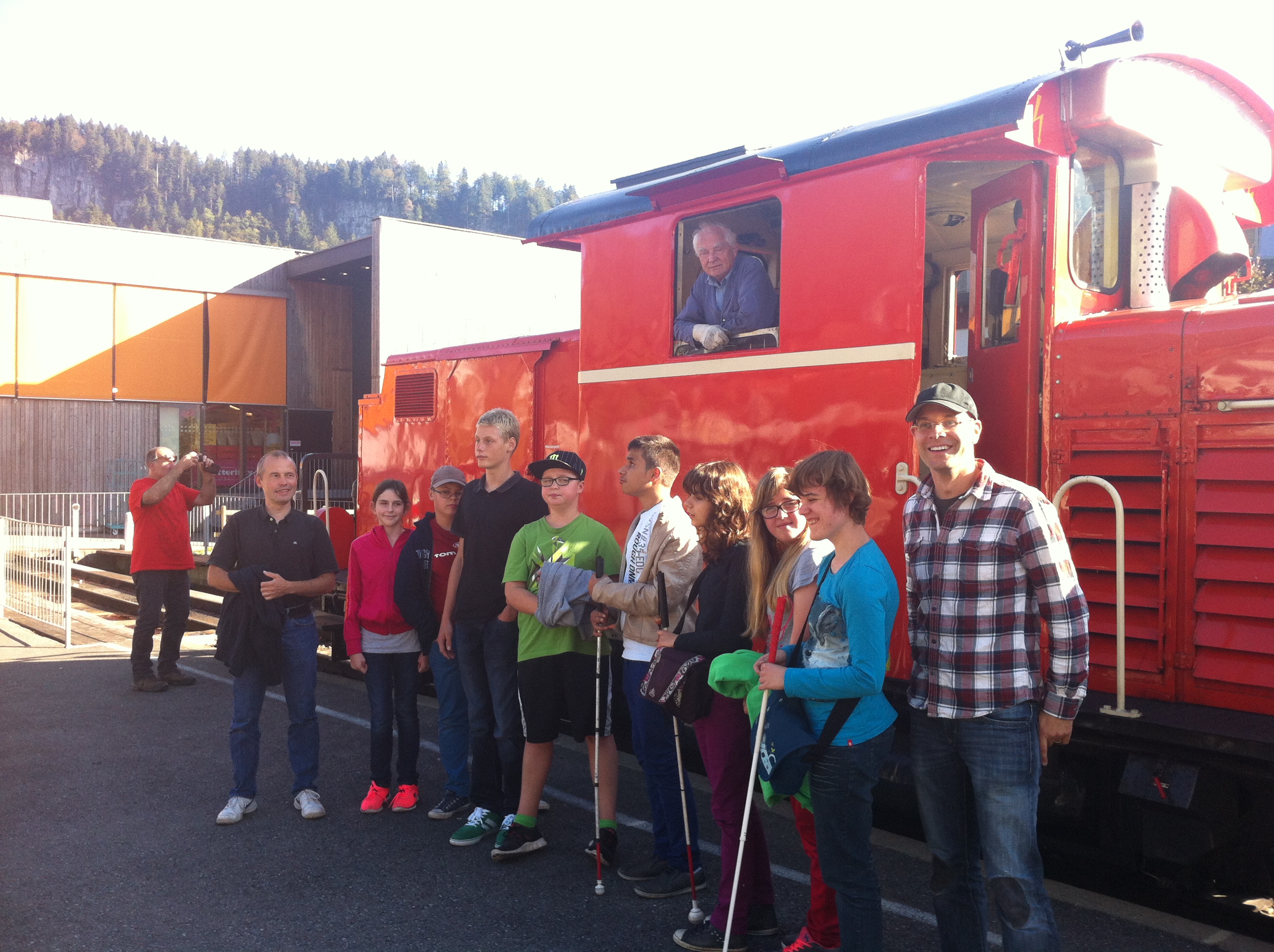Um viertel vor drei brachen wir dann bereits zu unserer ersten Unternehmung auf: Unser Ziel war der Bahnhof in Bezau (ein Nachbarort von Bersbuch). Dort fuhren wir mit dem Wälderbähnle. Das Bähnchen besteht aus einer historischen Lok und einigen Waggons, die mit Holzsitzen ausgestattet sind. Die Fahrt führte über eine historische Strecke von Bezau über Bersbuch bis nach Schwarzenberg (Nachbarort von Bersbuch), die von 1902 bis 1989 noch regulär im Betrieb war. Dabei konnten wir auch unsere Hütte wieder erkennen. Frau Liebers machte Fotos davon. Als wir wieder in Bezau ankamen, durften diejenigen, die wollten, mit auf den Führerstand der Lok kommen – und stellt euch vor: Batuhan, ein vollblinder Junge unserer Klasse, durfte sogar ganz alleine fahren! Anschließend konnten wir in der Reparaturhalle weitere Wagen und Loks besichtigen und bekamen vom Lokführer Einiges erklärt.