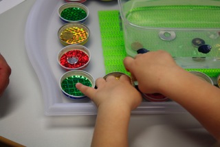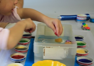Im praktischen Teil ging es zunächst darum, ein Spiel unter der Augenbinde zu erfahren, um dann einen Spielplan herzustellen. Dieser Spielplan ist so konzipiert, dass er möglichst variable Spielmöglichkeiten zulässt. Jede Familie konnte daher ein Spiel gestalten, das ganz genau auf ihr Kind abgestimmt war. Bei fast allen war es zunächst das „Schwimmbad-Spiel“: hier geht es darum, zu einem vorgegebenen Gegenstand mit den Händen nach einem zweiten in einer Wasserschüssel zu „tauchen“. Nach der Mittagspause mit Pizzabrötchen und leckeren Salaten ging es an die Erprobung des Spiels: alle Kinder und Eltern waren mit Begeisterung dabei. Bei einer gemütlichen Gesprächsrunde mit Kaffee und Kuchen klang der Kurs aus – allerdings nicht ohne den Inhalt für den nächsten Kurs festzulegen: das Thema wird voraussichtlich „Bewegung“ sein.