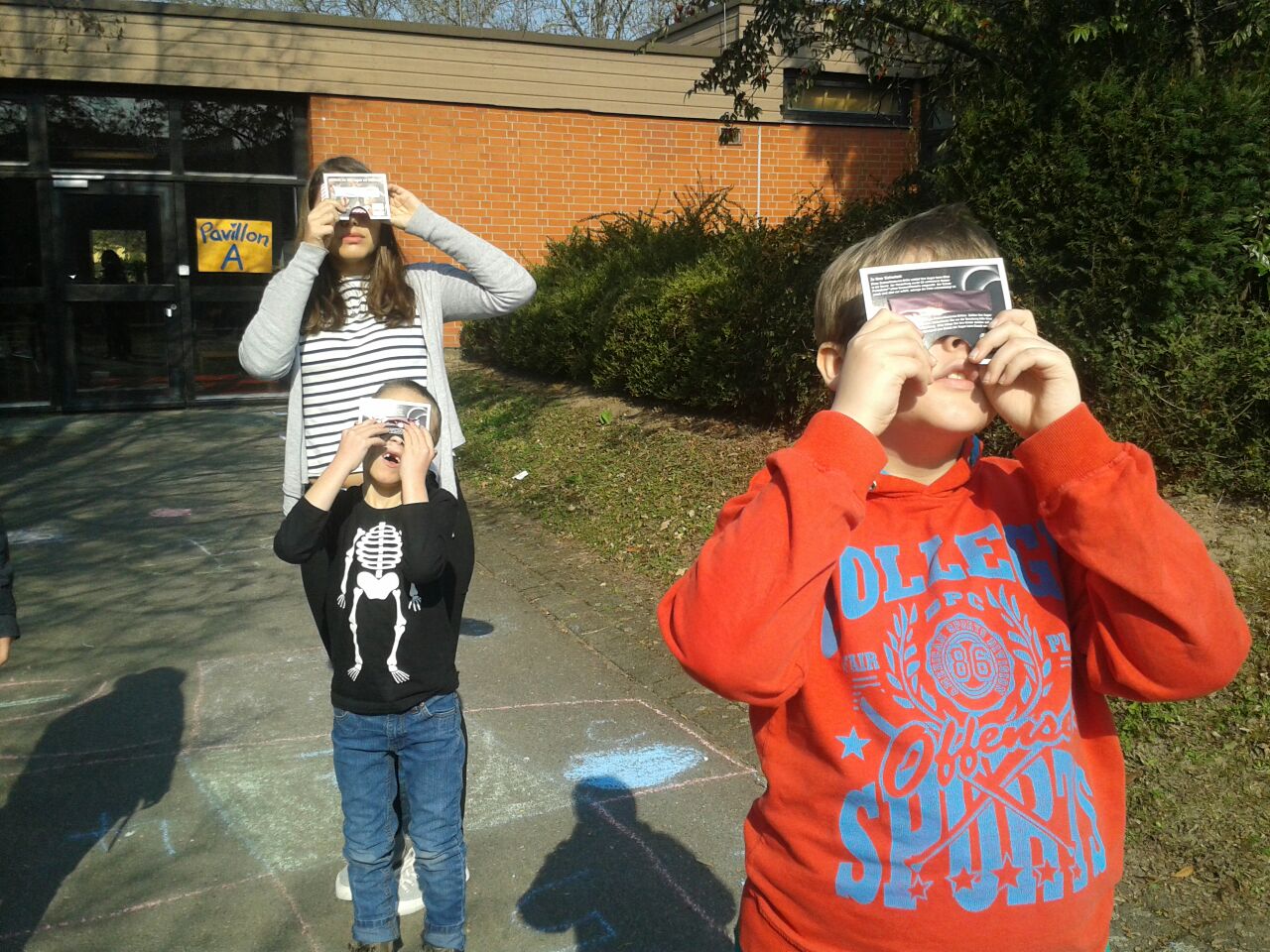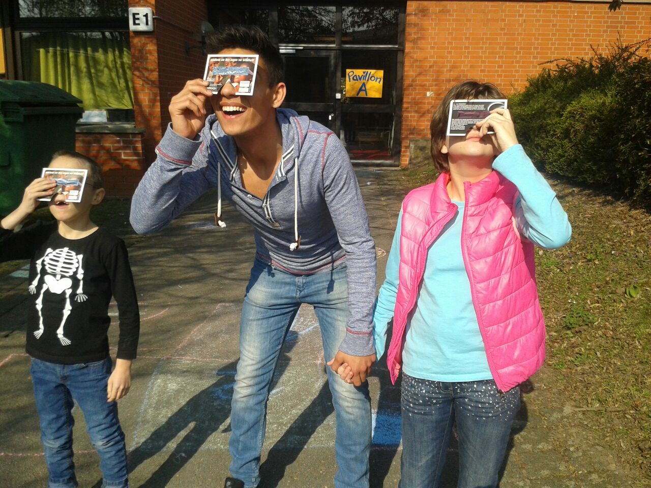 Heute haben wir die Sonnenfinsternis angeschaut. Da müssen wir auf die Augen aufpassen. Das wir nicht blind werden. Wir hatten spezielle Brillen auf. Im Zimmer hat man damit gar nix gesehen, nur draußen. Erst war die Sonne ein Viertel weg, dann ein halb und dann Dreiviertel und dann war sie wieder ganz da.