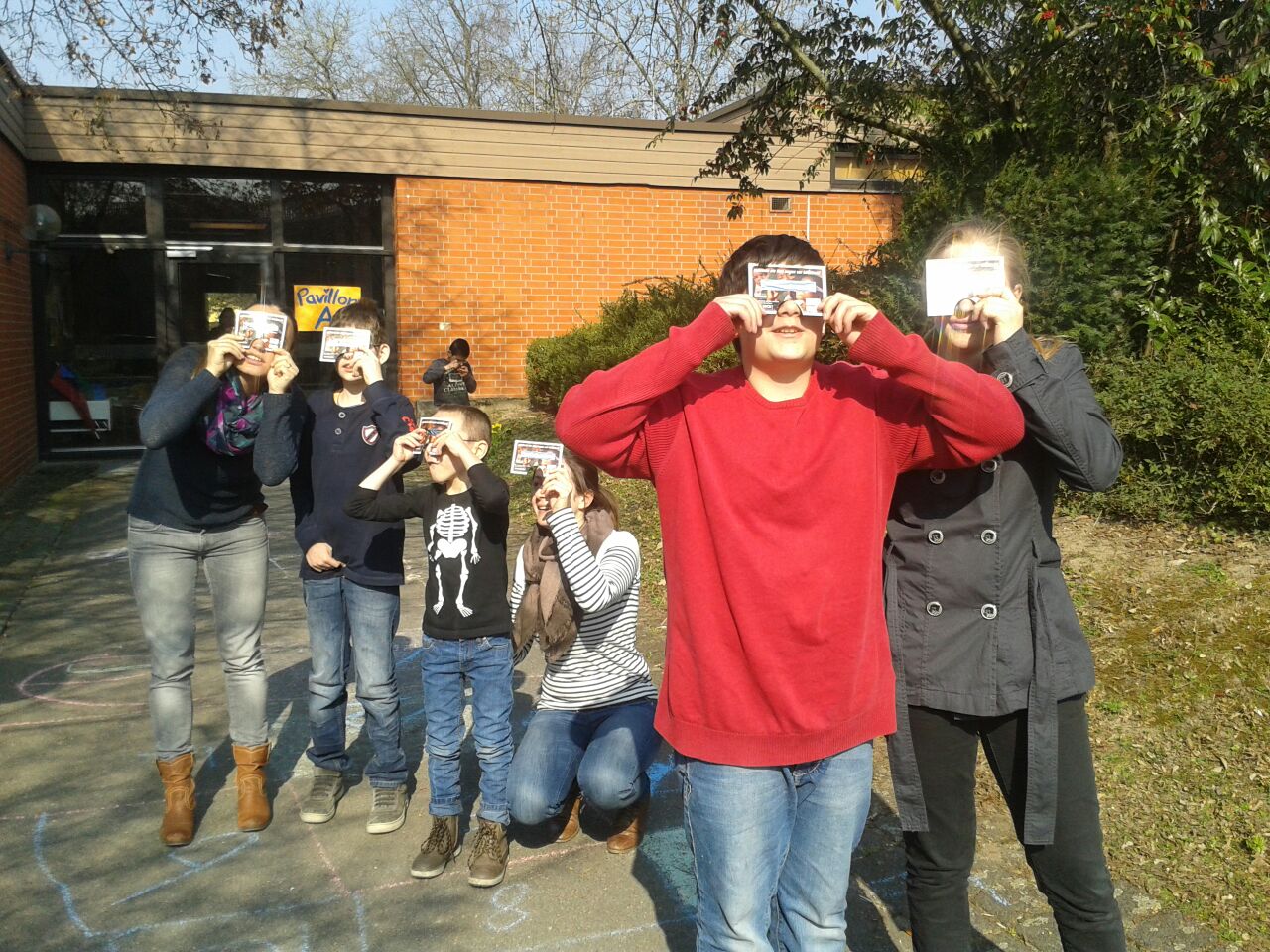 Lehrer und Schüler vor dem Pavillon A beim betrachten der Sonnenfinsternis am 20. März 2015