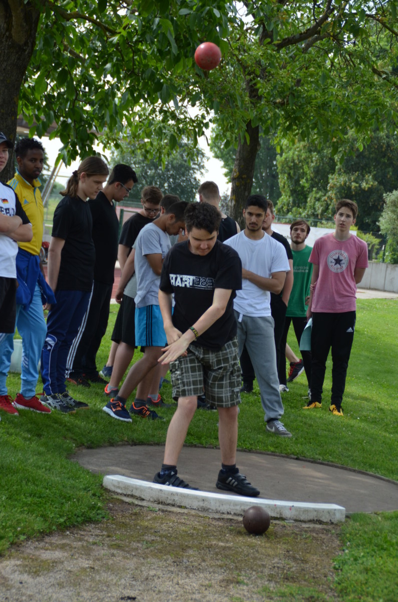 Die Schülerinnen und Schüler der Schlossabteilung maßen sich derweil im klassischen Dreikampf: Sprint, Weitsprung und Kugelstoßen bzw. Weitwurf. Anschließend meldeten sich noch knapp 40 Sportlerinnen Sportler für die Langstrecken an: Dort hieß es, bei mittlerweile glühender Hitze 1000 Meter oder gar 5000 Meter zu laufen. Bei spannenden Rennen wurden neue Bestzeiten gelaufen: Gleich zwei Schülern gelang es, die bis dahin magische Marke von 21 Minuten auf 5000 Meter zu unterbieten und stellten damit einen neuen Schulrekord auf!
