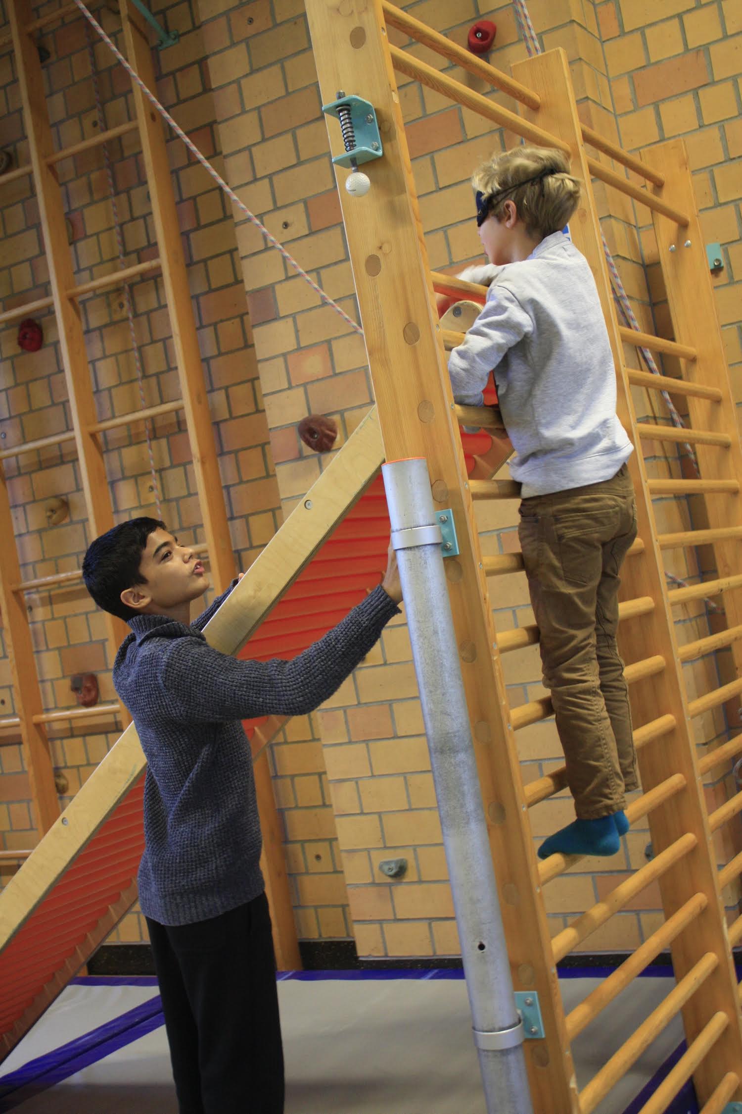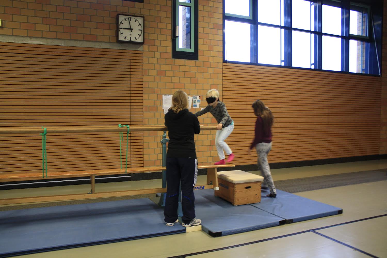 Zudem gab es unter anderem eine Kletter-Station, bei der man eine Sprossenwand erklimmen und oben herunterrutschen konnte, eine Sprungstation, wo man auf einen Kasten klettert und von dort aus auf eine dicke Matte springt und vieles mehr. So konnten die normalerweise sehenden Schüler erfahren, wie es ist, an einem fremden Ort zu sein,