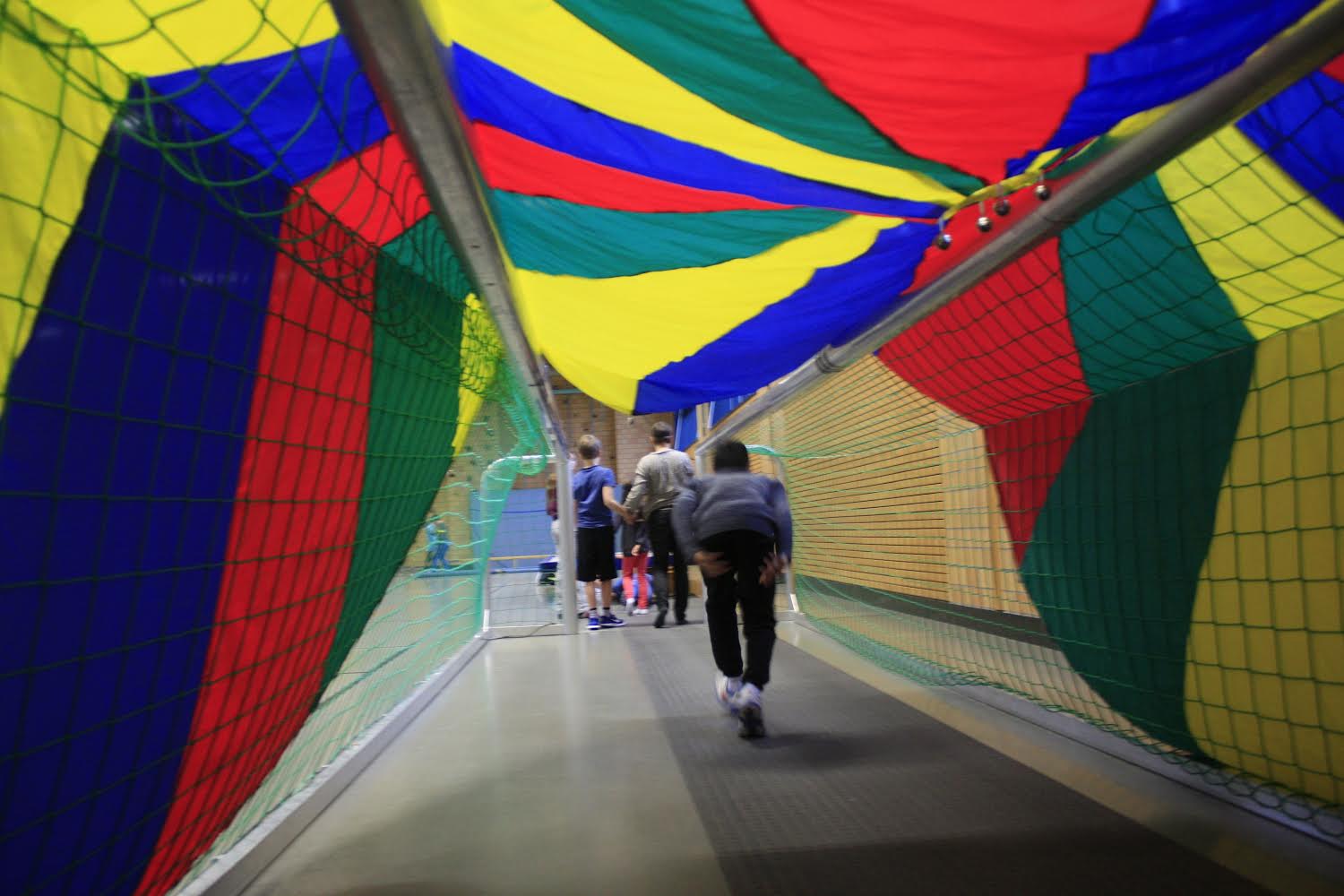 In der Sporthalle wurden die sehenden Kinder durch einen Parcours geführt. Dafür wurden sie zuvor mit Augenbinden ausgestattet und während der gesamten Zeit von einem blinden oder sehbehinderten Schüler der Schloss-Schule betreut. Zunächst musste man durch einen Tunnel kriechen, anschließend musste man mit einem Rollbrett fahren.