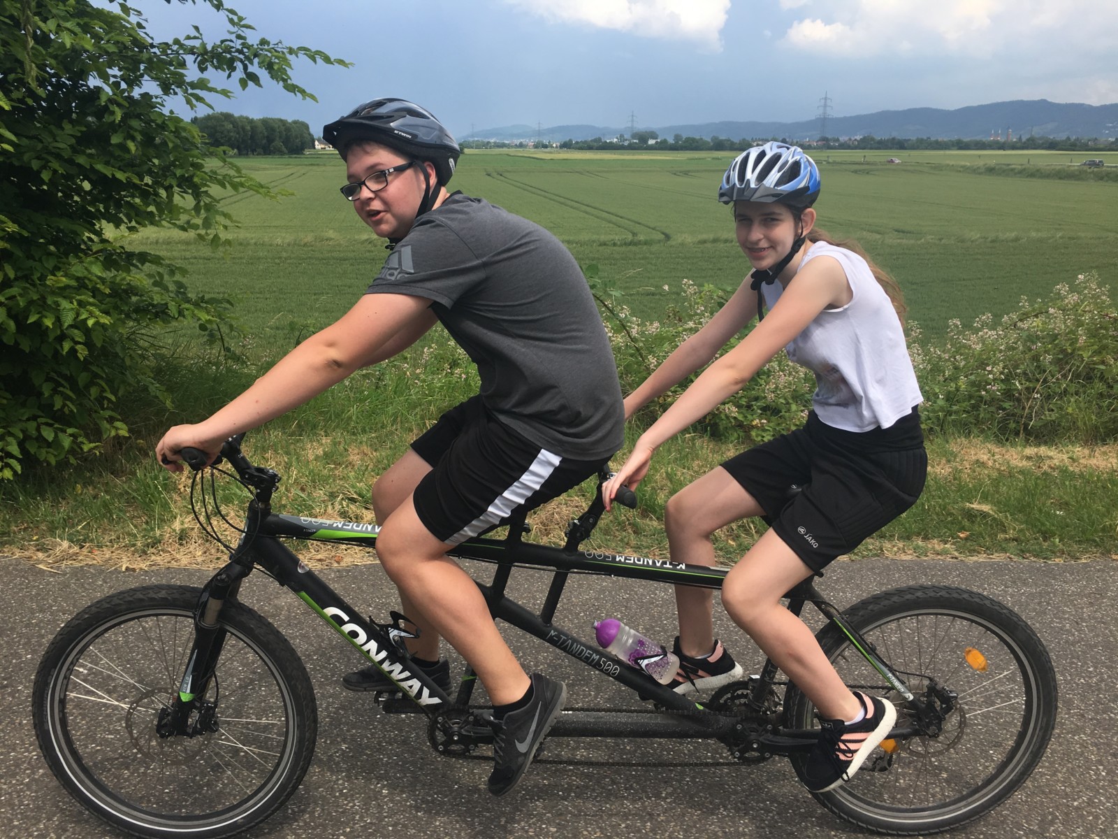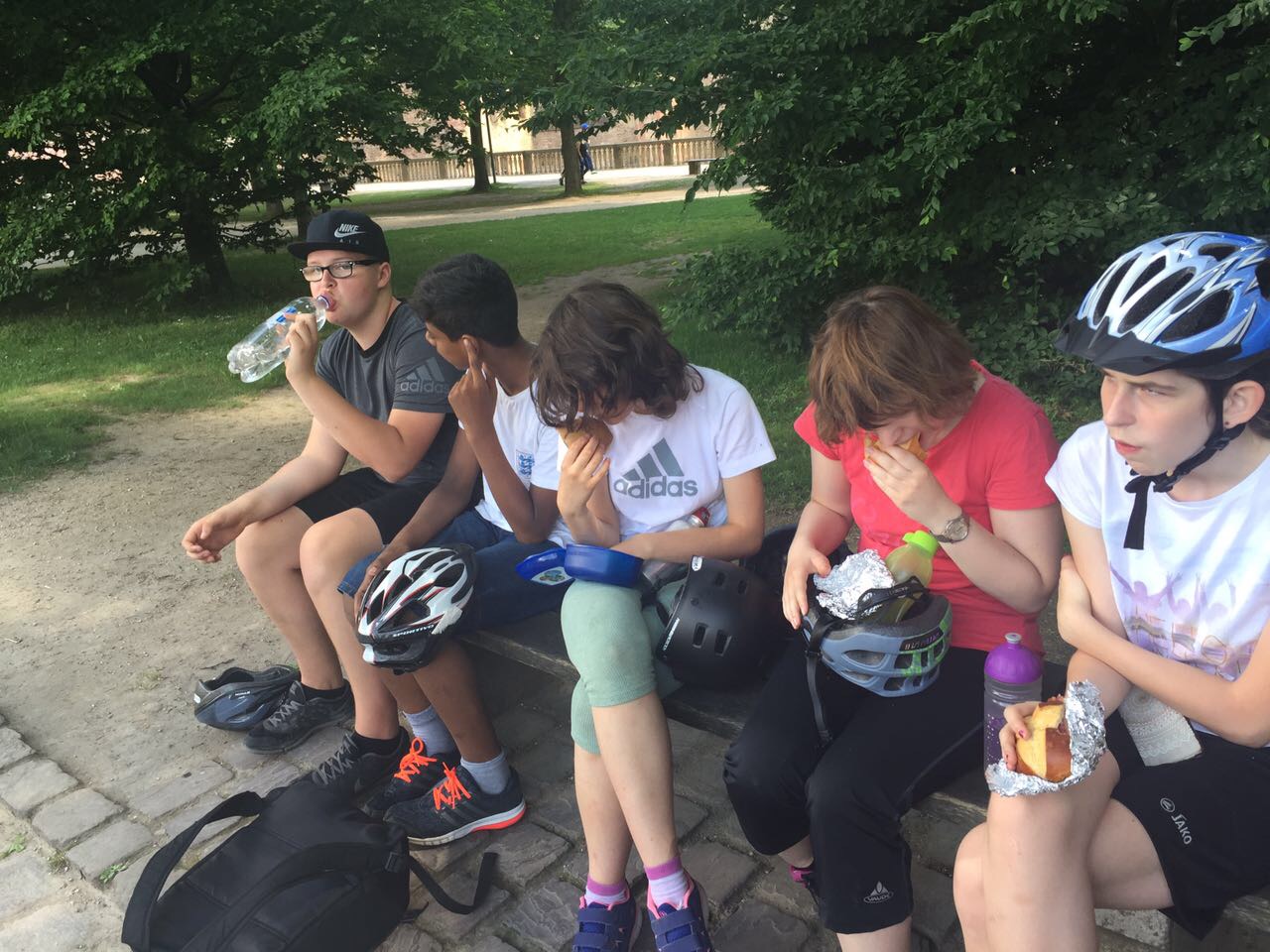 Heute standen wir gegen 07.30 Uhr auf, zogen unsere Betten ab, frühstückten und packten unsere Sachen zusammen. Um 10.00 Uhr ging es dann wieder auf die Tandems. Diesmal fuhren wir nach Heidelberg. Dort fuhren wir zunächst durch die Altstadt, bevor wir uns in zwei Gruppen aufteilten. Die eine Gruppe fuhr mit den Tandems bis zur Molkenkur (das ist zwischen dem Schloss und dem Gipfel des Königsstuhls), die anderen stiegen die 313 Stufen bis zum Schloss hinauf und machten im Schlosspark Pause, bis die anderen wieder zurückkamen. Gerade die Personen, die mit dem Tandem gefahren sind, mussten an ihre Grenzen gehen, aber auch die Läufer hatten viel Spaß. Als alle wieder beisammen waren und etwas gegessen und getrunken hatten, beschlossen wir, zurück zur Schule zu fahren. Die Radfahrer fuhren mit den Rädern hinunter, die Treppenläufer nahmen wieder die Treppe. Es war im Wetterbericht Gewitter vorhergesagt und es grummelte auch leise, und so gaben wir ziemlich Gas, um noch vor dem großen Unwetter in die Schule zu kommen. Je näher wir Ilvesheim kamen, desto dunkler wurde der Himmel und wir hatten echt Sorge, ob wir es rechtzeitig schaffen würden, aber glücklicherweise verzog sich die Wolkenwand irgendwann und wir blieben, abgesehen von vereinzelten Tropfen, trocken. Wir waren so schnell, dass wir die Schule fast eine Stunde früher als geplant erreichten. So hatten wir genug Zeit, zu duschen und die restlichen Sachen einzupacken und aufzuräumen. Manche Eltern holten ihre Kinder ab, die Mehrheit fuhr aber selbstständig nach Hause. Auf dem Weg zum Bahnhof gingen alle, die noch da waren, gemütlich Eis essen und stiegen anschließend in die Züge.