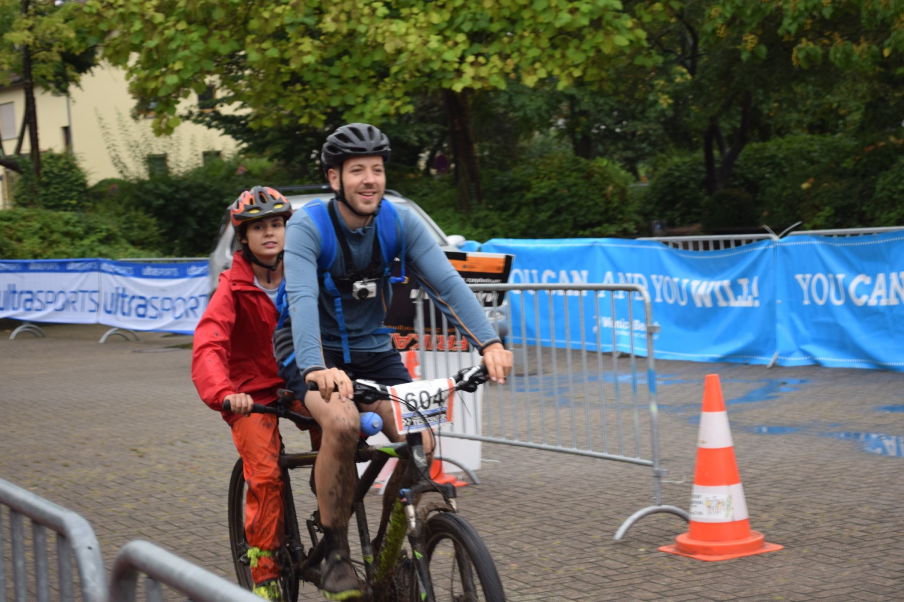 Um 09.30 Uhr trafen wir uns am Veranstaltungsort, schauten, ob wir alles dabei hatten (Trinken, Fahrradwerkzeug usw.) und stellten das Tandem ein. Schon hier regnete es ohne Unterlass und uns war bewusst, dass es nicht einfach werden würde. Trotzdem waren wir voll motiviert, als es um 10.05 Uhr auf den 30 Kilometer langen Rundkurs ging. Da wir ausschließlich mit sehenden Fahrern gemeinsam starteten, wurden wir separat gewertet. Zunächst fuhren wir eine kleine Runde durch die Weinberge, um uns noch einmal dem Publikum zu zeigen, bevor wir endgültig im Wald verschwanden. Dort ging es richtig zur Sache: Es war so matschig, dass unsere Kette klemmte und wir mindestens viermal anhalten mussten. Schlussendlich lösten wir das Problem, indem wir das Fahrrad an einem Bach reinigten, der glücklicherweise genau an unserer Route lag. Nach einem „normalen“ Waldweg ging es steil bergauf. Hier mussten wir das Rad teilweise schieben, da der Boden so durchgeweicht war, dass man nicht mehr darauf fahren konnte, wobei man dazu sagen muss, dass unsere Reifen nicht unbedingt für diese Bodenverhältnisse geeignet waren. So mussten wir auch bei den teils steilen Abfahrten gut aufpassen. Einmal ist uns das Tandem sogar fast umgekippt, Gott sei Dank konnten wir schnell abspringen.