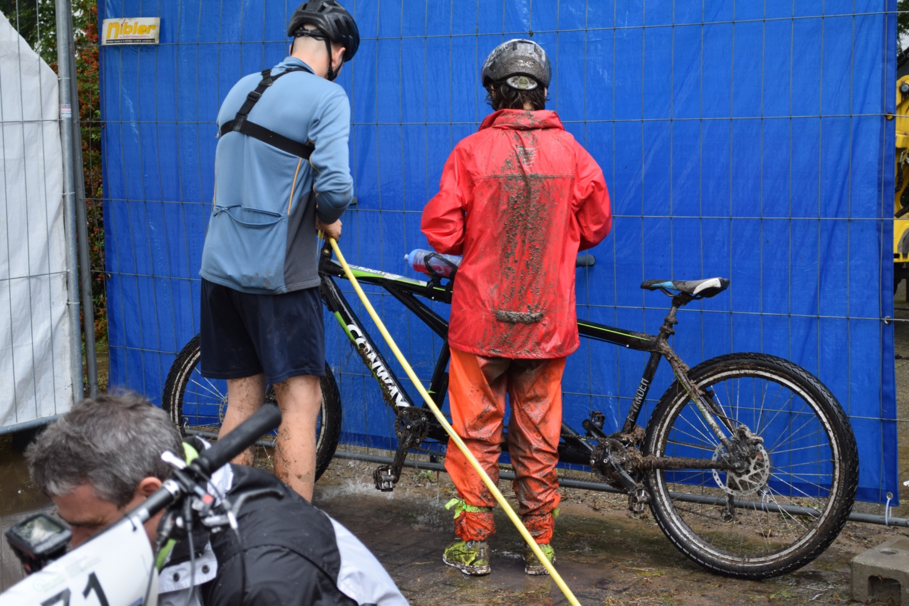 So ging es bergauf, bergab. Mal regnete es, mal nicht, aber das machte fast keinen Unterschied, denn Wasser und Schlamm spritzten hoch und nasser konnten wir jetzt eh nicht mehr werden. Am Ende kam nochmal ein Streckenabschnitt durch den Ort, der relativ problemlos zu fahren war, dann erreichten wir das Ziel. Die Zeit: Drei Stunden und 29 Minuten, 785 Höhenmeter und 37 km/h Höchstgeschwindigkeit. Es war anstrengend, aber wir waren glücklich – und vor allem erstmal verdreckt. Also ging es für uns und unser Rad erstmal in die „Waschanlage“. Dort waren Schläuche, so ähnlich wie Gartenschläuche, mit denen man seine Kleidung und sein Fahrzeug abspritzen und somit von Schlamm und sonstigem Dreck befreien konnte. Es brauchte seine Zeit, aber schließlich war alles wieder sauber. Hiermit waren wir bereit für den Heimweg.