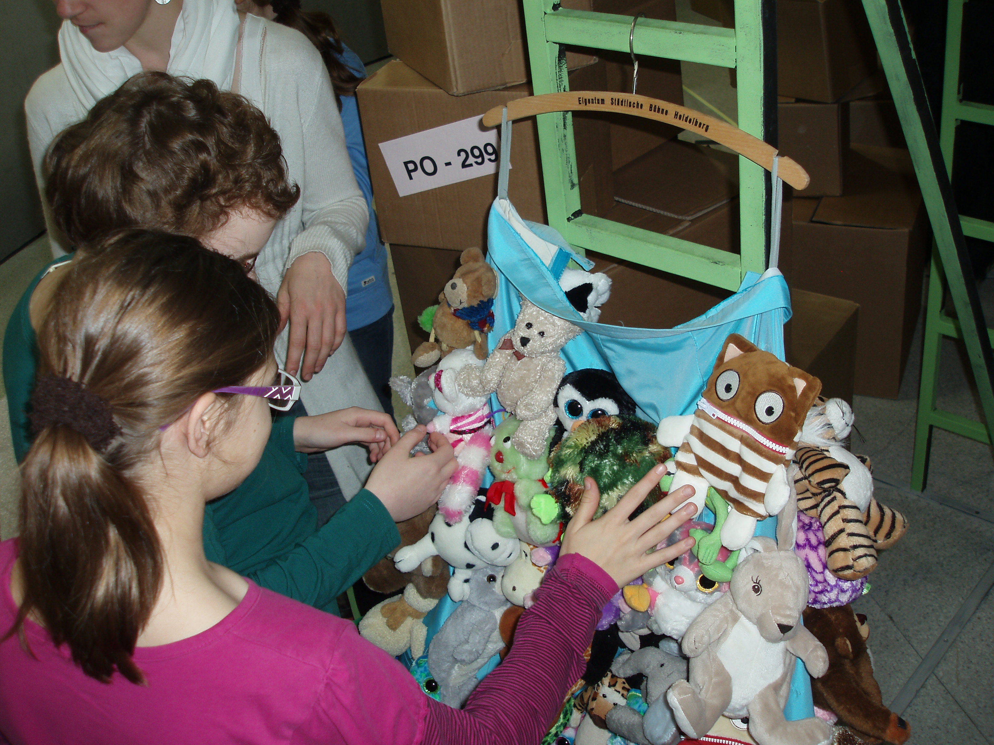 Als wir ins Theater rein sind, war dort ein großer Saal. Herr Kaul hat uns empfangen. Er ist mit uns auf die Bühne gegangen. Wir durften alles anschauen. Eine Frau hat uns ein Kostüm gezeigt da waren ganz viele Kuscheltiere dran. Und auch ein Sorgenfresser. Sie hat uns noch 2 Perücken gezeigt – die eine war rot und hoch gesteckt. Die andere Perücke hatte eine Krone drauf und die Haare waren auf und dann haben sie uns noch eine große Rampe gezeigt die sah aus wie eine Banane. Dann gings los.