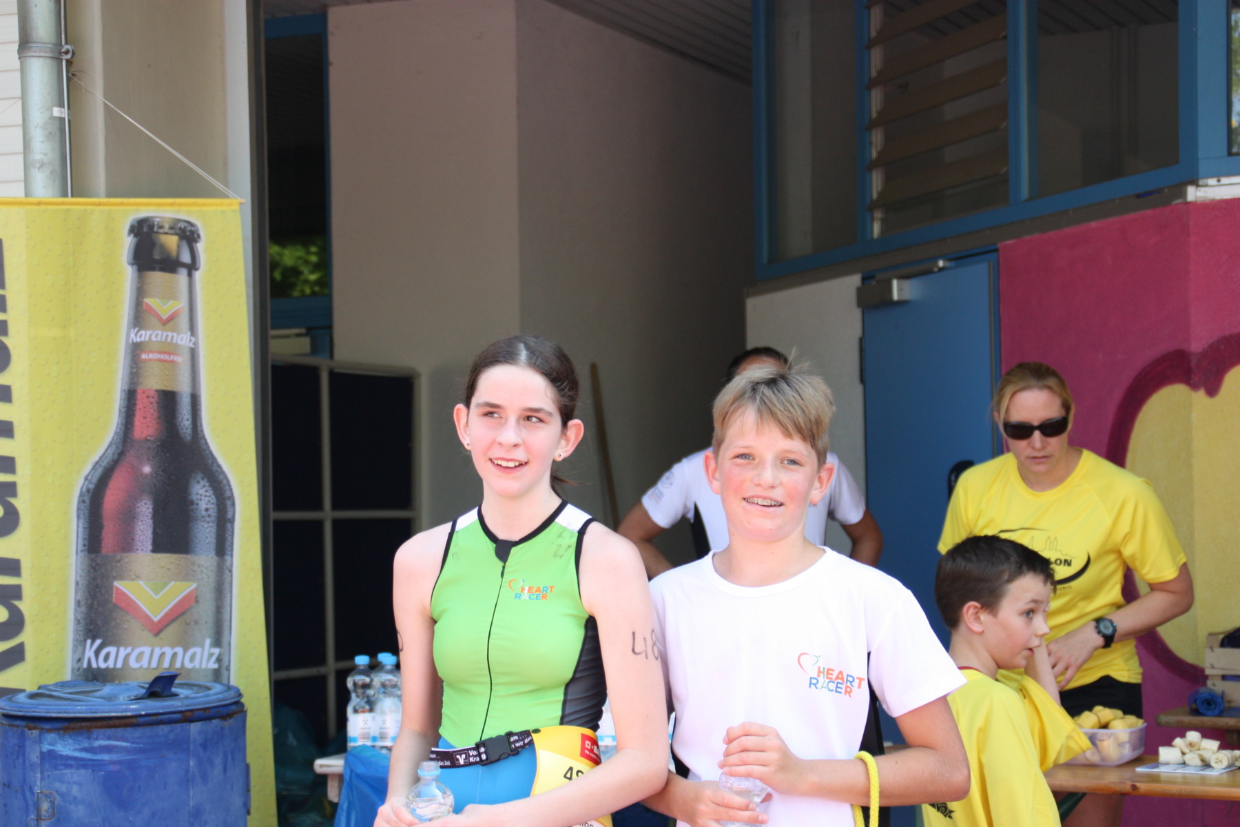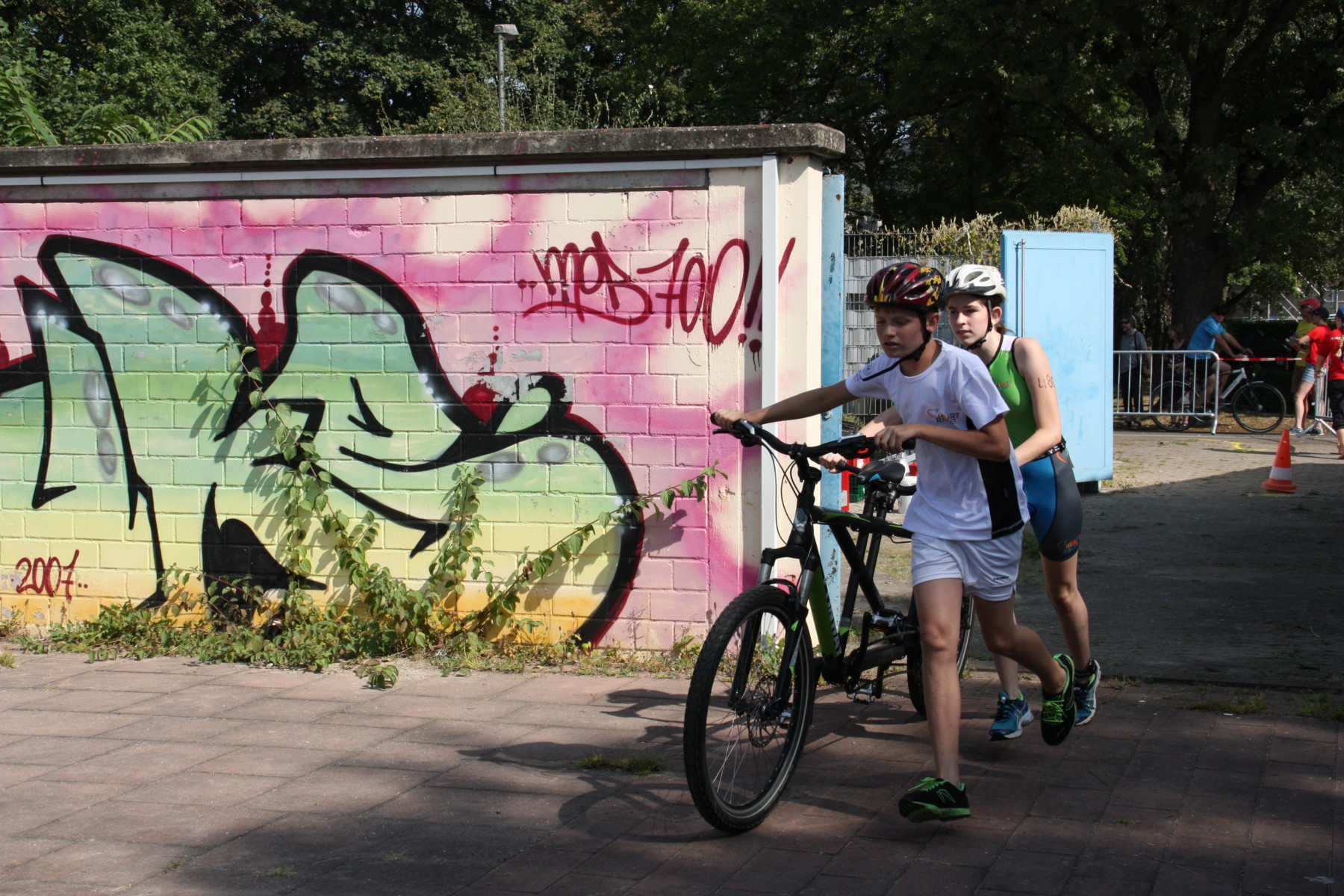 Kerstin, Sophie und Lasse starteten gemeinsam mit 26 weiteren Triathleten in der Altersgruppe Jugend B. Sie mussten nach 200 Meter im Schwimmbad eine Radstrecke von 12 Kilometern zusammen mit ihren Guides auf dem Tandem und anschließend eine Laufstrecke von 2,8 km absolvieren. Bei Lasse konnte man sehen, dass er in den Ferien fleißig trainiert hatte: Gemeinsam mit seinem Guide Markus erlief er sich mit einer Gesamtzeit von 46 Minuten und 48 Sekunden den 15. Platz! Kerstin und Sophie ließen es bei der Hitze etwas gemächlicher angehen. Nach einer Gesamtzeit von 57 Minuten und 6 Sekunden erreicht Sophie mit ihren Guide Carsten das Ziel. Kerstin folgte kurz darauf mit Katharina als Guide mit einer Gesamtzeit von 1 Stunde und 10 Minuten.