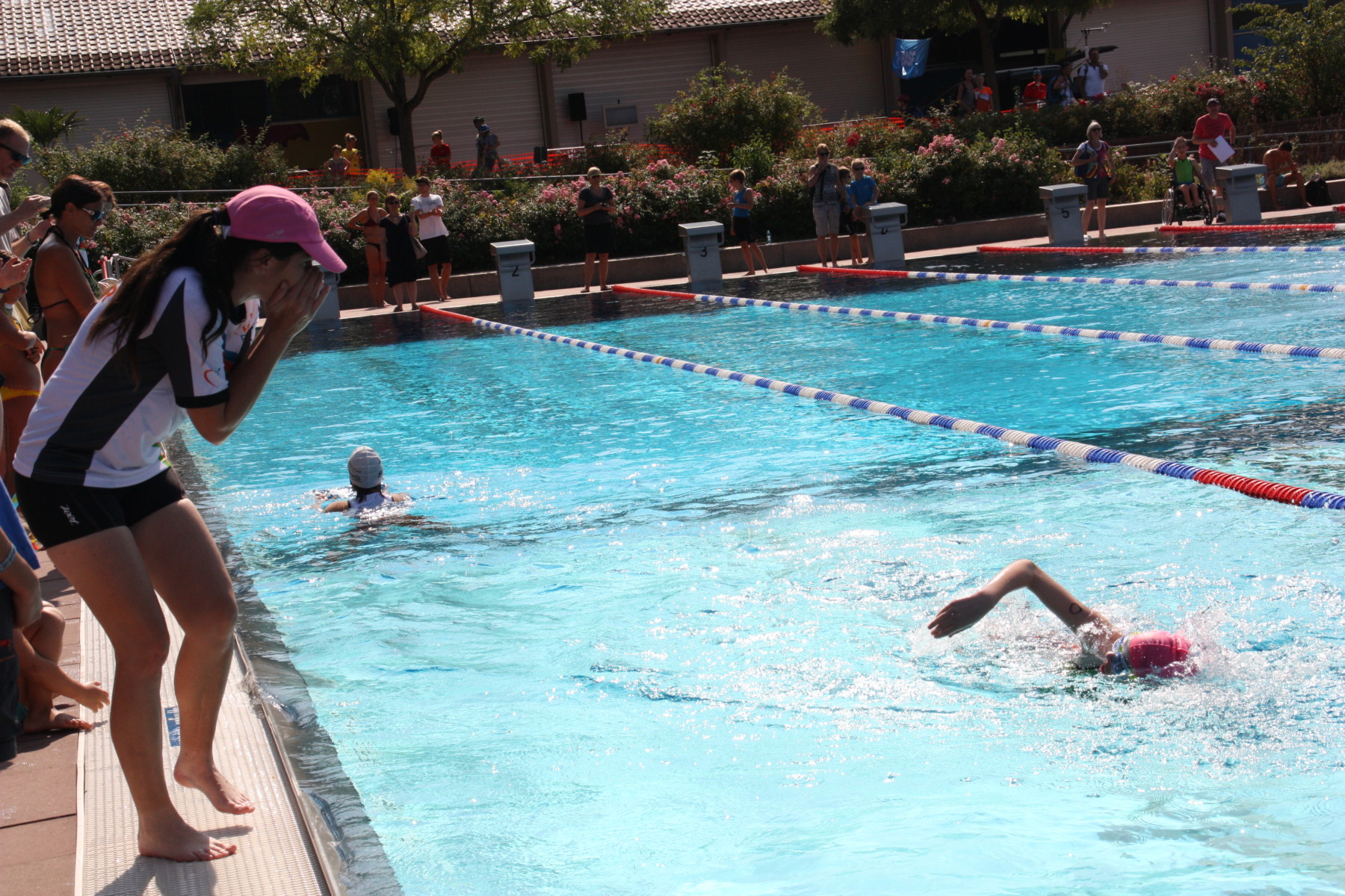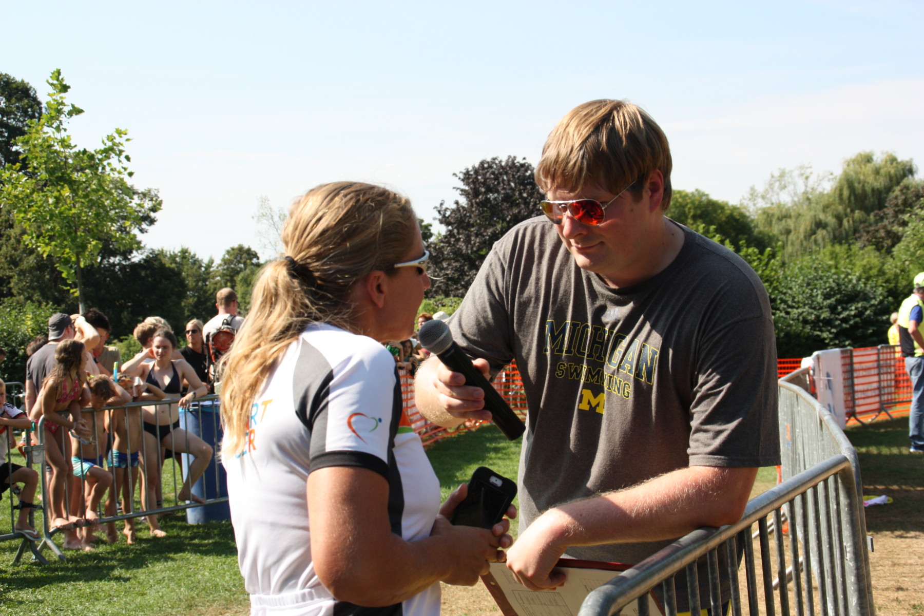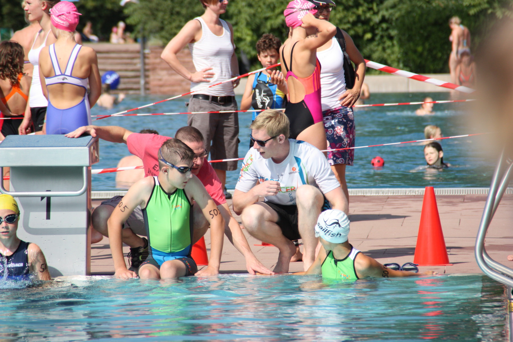 Kerstin, Sophie und Lasse starteten gemeinsam mit 26 weiteren Triathleten in der Altersgruppe Jugend B. Sie mussten nach 200 Meter im Schwimmbad eine Radstrecke von 12 Kilometern zusammen mit ihren Guides auf dem Tandem und anschließend eine Laufstrecke von 2,8 km absolvieren. Bei Lasse konnte man sehen, dass er in den Ferien fleißig trainiert hatte: Gemeinsam mit seinem Guide Markus erlief er sich mit einer Gesamtzeit von 46 Minuten und 48 Sekunden den 15. Platz! Kerstin und Sophie ließen es bei der Hitze etwas gemächlicher angehen. Nach einer Gesamtzeit von 57 Minuten und 6 Sekunden erreicht Sophie mit ihren Guide Carsten das Ziel. Kerstin folgte kurz darauf mit Katharina als Guide mit einer Gesamtzeit von 1 Stunde und 10 Minuten.