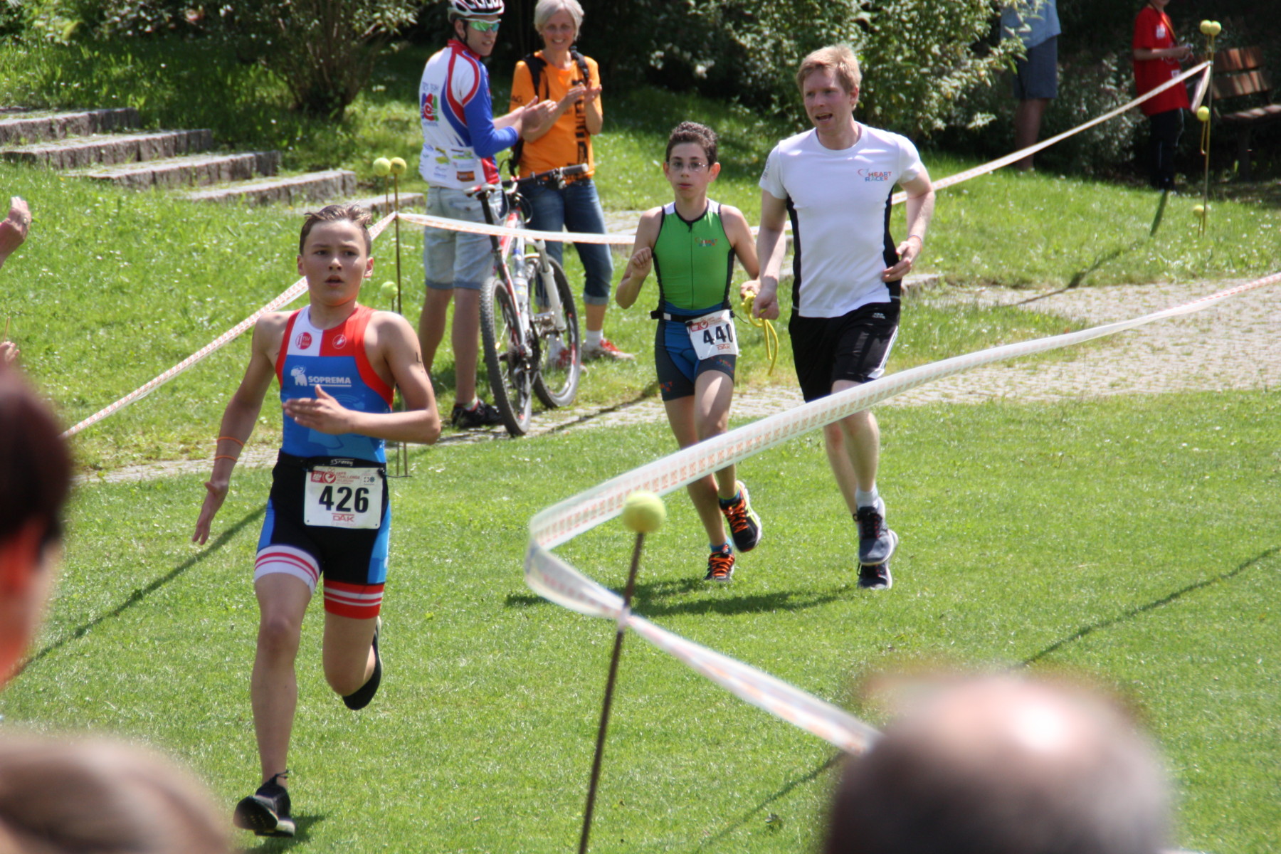 Ganz aufgeregt ging Jan, unser jüngster Triathlet, als Erster an den Start. Bei seinem ersten Triathlon musste er 100m Schwimmen, 4800 Meter auf dem Rad absolvieren und zum Abschluss noch 1600 Meter Laufen! Gemeinsam mit seinem Guide Fabian, die durch das Training ein gut eingespieltes Team waren, absolvierte er den Wettkampf in 20 Minuten und 54 Sekunden, was ihm den 15. Platz von 29 einbrachte! Für den ersten Triathlon eine super Leistung, die mit einem Finisher-T-Shirt und Medaille geehrt wurde!