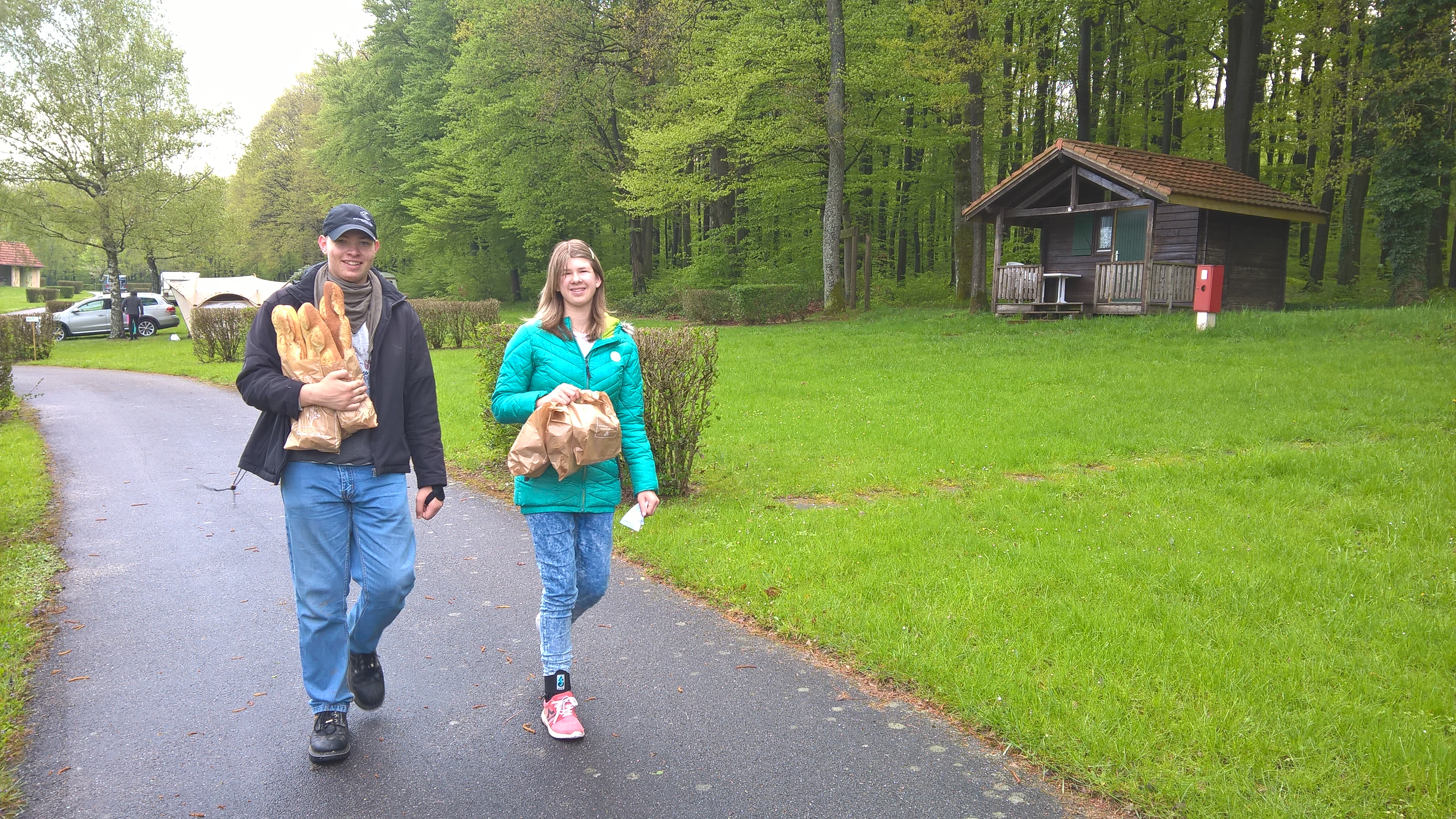 Nun war es auch schon Zeit, zum Campingplatz zu fahren. Dort hatten wir zwei einfache Holzhütten gemietet, in denen jeweils fünf Personen schlafen konnten. Die Hütte bestand aus zwei Räumen: Der erste Raum war ein verhältnismäßig großer Raum, aber deutlich kleiner als ein Wohnzimmer, mit einem 2-Platten-Herd, einem Tisch und fünf Hockern. Hier konnten zwei Personen schlafen. Im Schlafraum, einem kleineren Raum, der sogar mit einer Tür vom großen Raum abgetrennt war, gab es zwei Schlafmöglichkeiten, eine dritte befand sich direkt unter dem Dach. Am Ende einer langen, steilen Leiter. Toiletten, Waschbecken und Duschen gab es nicht, dafür musste man immer raus und rüber ins Waschhaus. Das Blöde war, dass es, kaum wwaren wir da, anfing zu regnen und bis zum nächsten Morgen nicht mehr aufhörte. Dennoch ließen wir uns davon nicht die gute Laune verderben, sondern erkundeten lieber den Campingplatz, packten aus oder hörten Musik. Zum Abendessen gab es Reis mit einer Art Chili Con Carne, wobei es noch einige französische Dinge wie Hartwurst und zum Nachtisch Mousse au chocolat oder Mousse au vanille gab. Da es schon wieder ziemlich spät war, ging es direkt in Richtung Waschhaus – bei strömendem Regen, Wind und Kälte – Gott sei Dank gibt es Regenschirme …