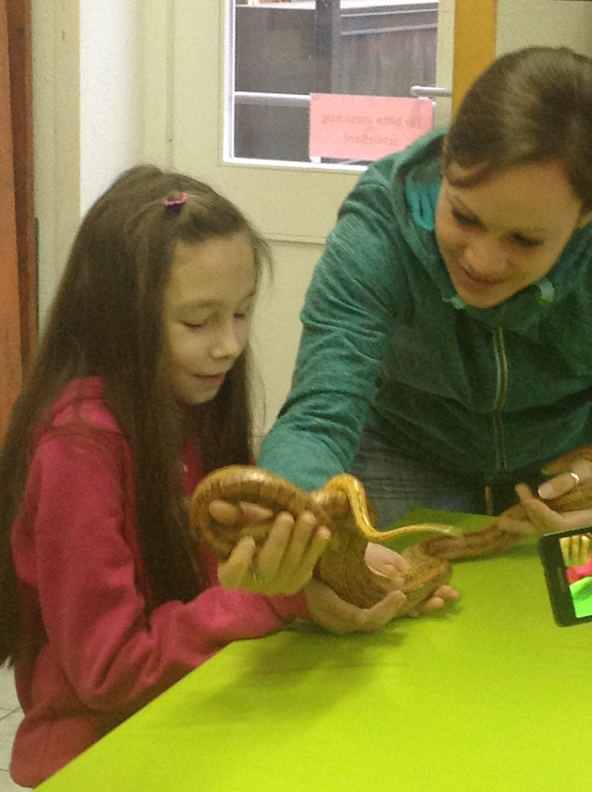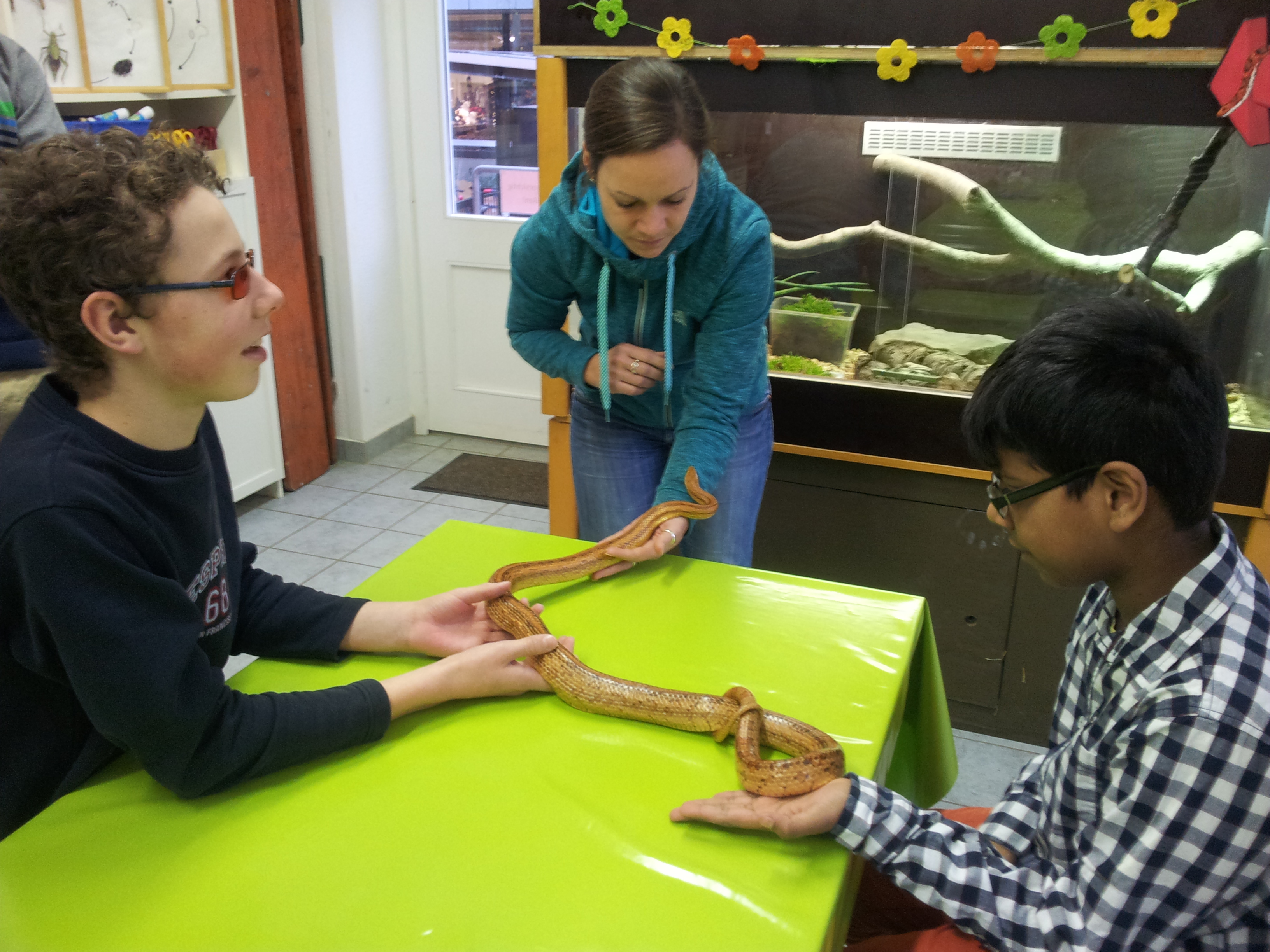 Alle Kinder von der G4/5 waren dabei außer Lenka, in der Zooschule. Wir alle haben uns getraut eine echte Schlange zu streicheln.