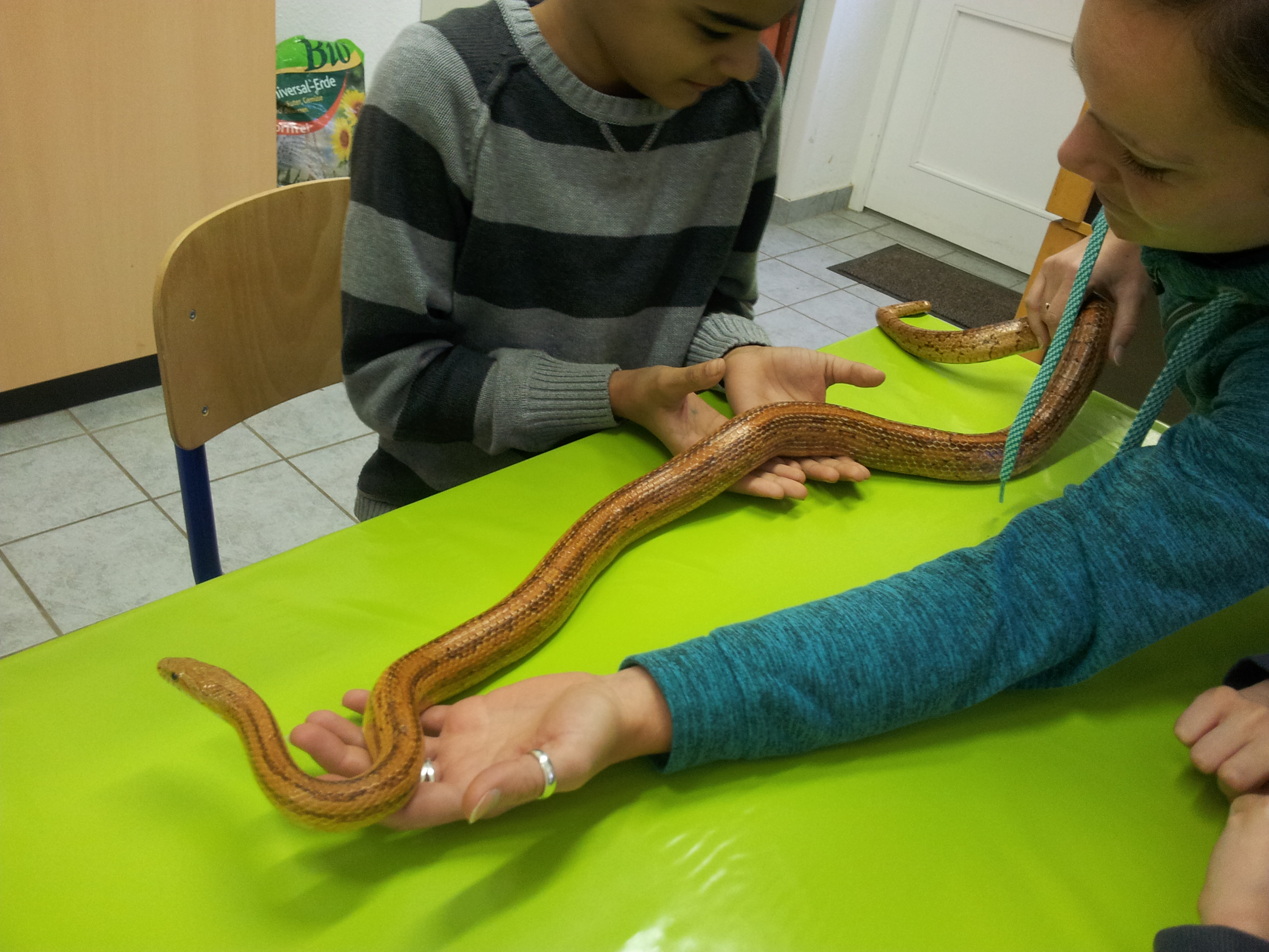 Wir waren um 8.40 Uhr in der Schule und sind sofort losgefahren nach Heidelberg. Als wir in der Zooschule waren, waren die Studenten und Studentinnen schon da. Auch Frau Vogt war hier. Und ich und Luca, wir haben echte Kornnattern angefasst. Und ich habe selbst erst nicht glauben können, dass ich mich getraut habe, diese Schlange anzufassen.